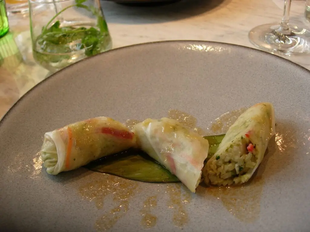 - Les rouleaux de printemps revisités (11 €), riz au gingembre, purée de sésame, concombre & sauce Wasabi.