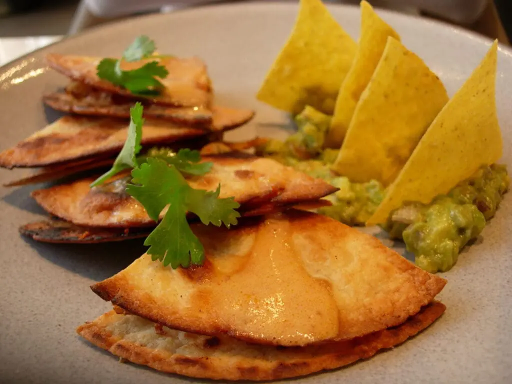 - Les So Cal Quesadilla Tinga (12 €) poulet, brie, emmental, salsa de maïs rôti, crème fraîche, chips et guacamole.