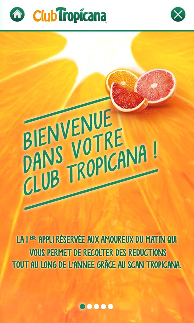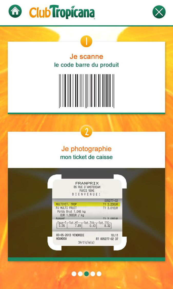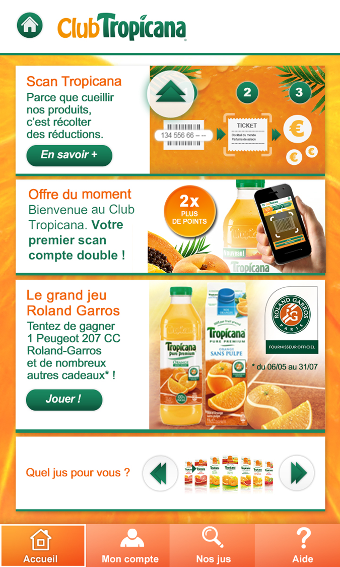 - Le scan Tropicana qui permet aux membres du Club Tropicana de faire fructifier chacun de leurs achats Tropicana. Le principe est simple, chaque produit acheté et scanné permettra de cumuler des points qui pourront se transformer en bons de réduction ou en virements bancaires.