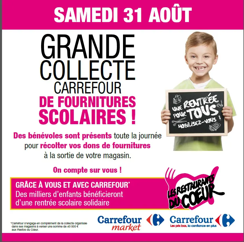 Le 31 août, l’enseigne organise une collecte nationale de fournitures scolaires au profit des Restos du Cœur. Les clients pourront déposer des fournitures neuves à l’entrée de leur magasin qui seront ensuite redistribuées par l’association aux plus démunis. L’année dernière, grâce à cette initiative, Carrefour avait récolté près de 77 tonnes de fournitures scolaires.