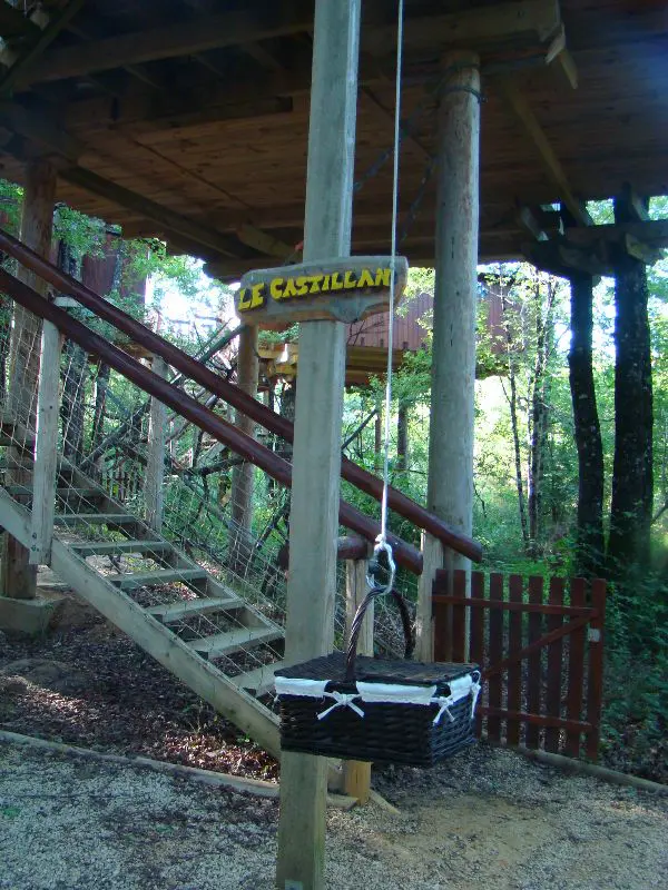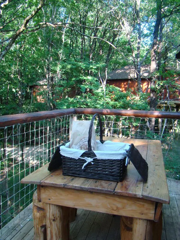 Le petit plus : le matin on hisse du haut de notre cabane le panier laissé à cet effet la veille pour récupérer le petit déjeuner laissé le matin même par le boulanger du site. Tellement charmant !