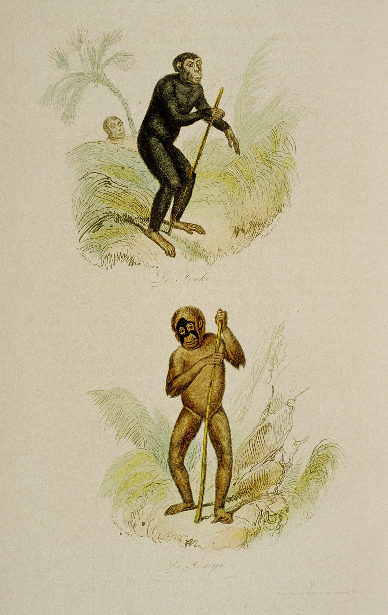 L’exposition retrace également l’histoire des connaissances sur les grands singes. Au XVIIe siècle, avec les colonies, les Européens voient arriver les premiers chimpanzés et orangs-outans d’Afrique et d’Asie. Les singes deviennent des bêtes de cirque ou font l’objet d’expérimentations scientifiques cruelles.