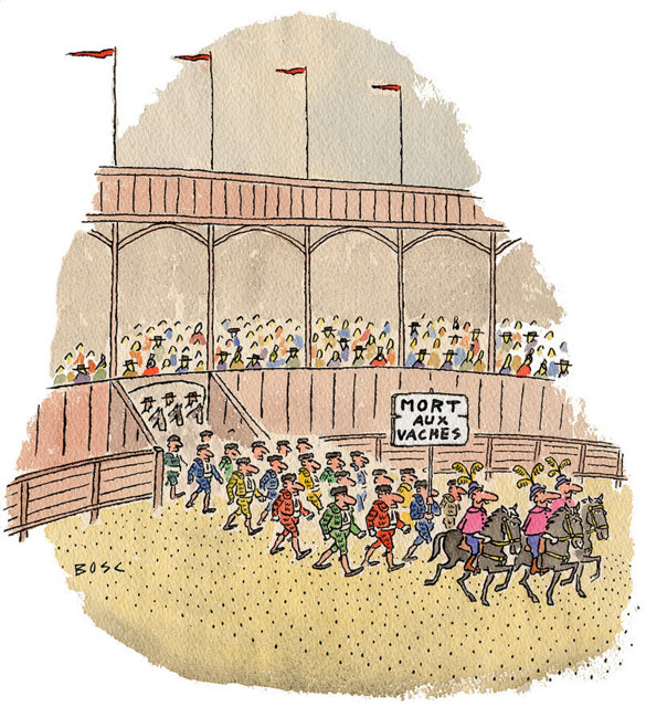 Marqué par la guerre d’Indochine à laquelle il a participé, Bosc dénonce les horreurs et les absurdités des conflits armés.