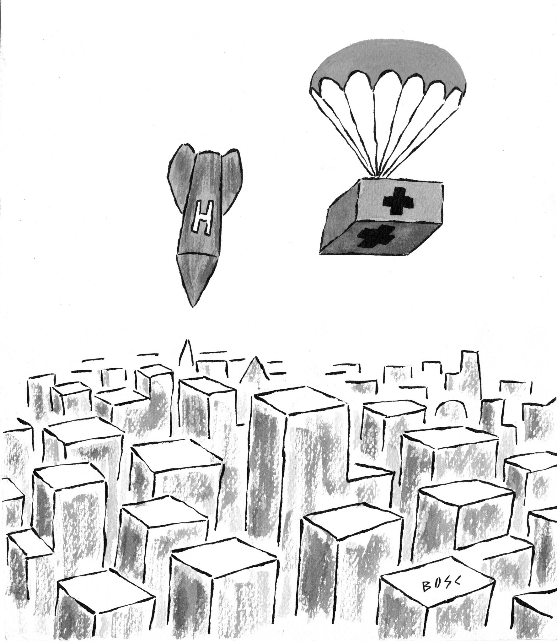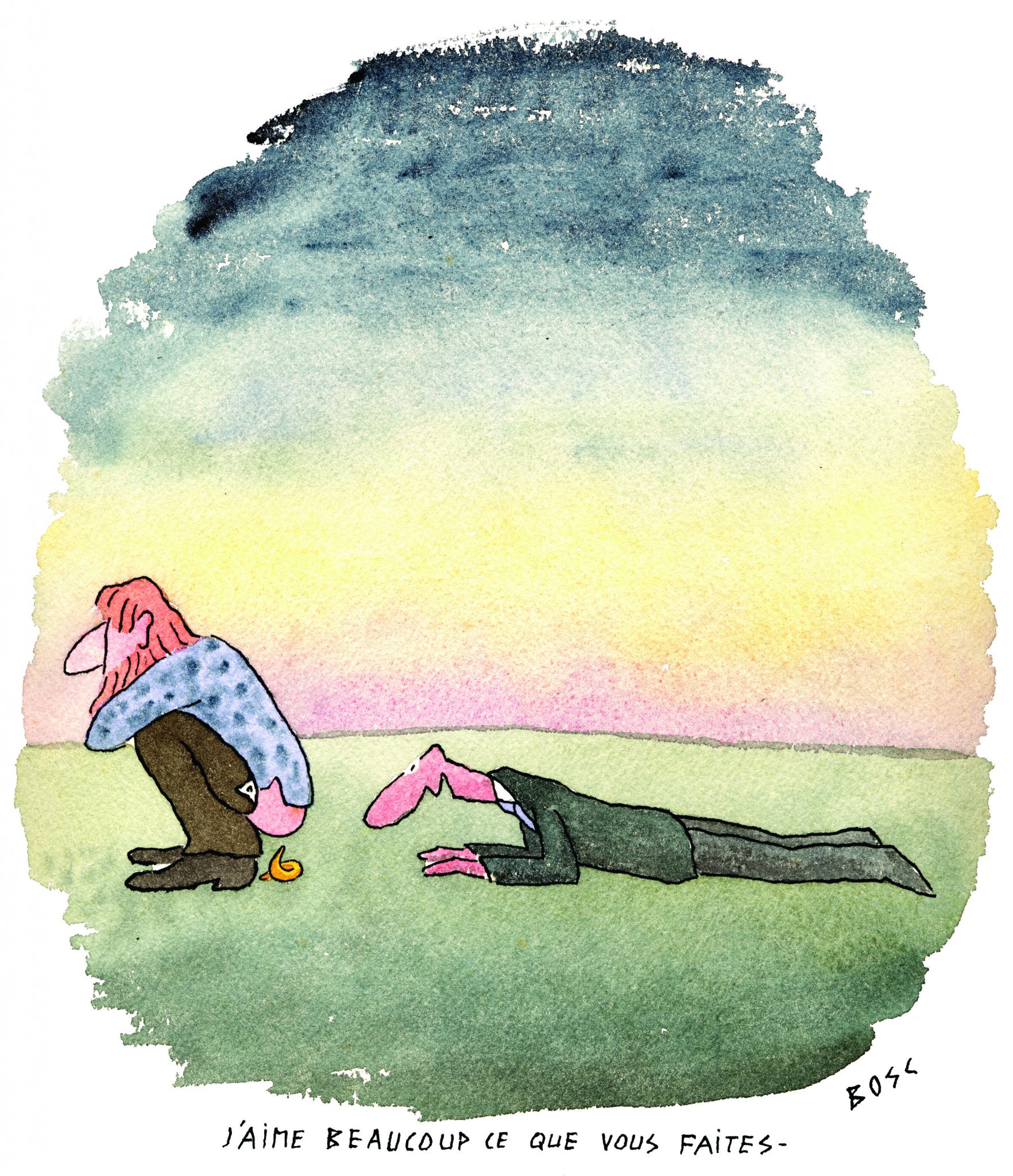 Bosc a inspiré entre autres Sempé et deux chers disparus : Cabu et Wolinski. L’exposition présente d’ailleurs la dernière « une » de Hara-Kiri et la première de Charlie Hebo. Émouvant.