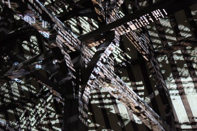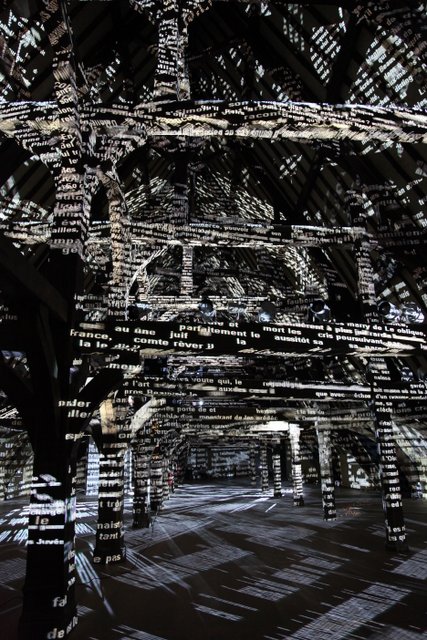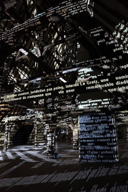 Dans l’espace plongé dans l’obscurité, on découvre des mots mouvants, projetés sur le sol, les poutres et les murs par 16 ordinateurs. Ces mots sont en lien avec l’histoire du palais et du musée. Il y a par exemple un poème du 15e siècle de Jehan Regnier, retenu captif dans l’attente d’une rançon dans la tour Beauvisage du palais épiscopal et qui rédigea des poésies réunies sous le nom de « Fortunes et adversités ».