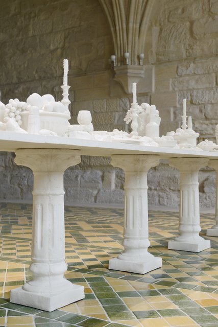 Avec « The Last Supper » (La Cène), produite pour la salle du Chapitre, Ken et Julia Yonetani nous convient à un drôle de banquet. La référence à l’histoire de l’art et notamment à la Cène de Léonard de Vinci est directe. Sur la table en sel tout en longueur se déploie un festin, lui aussi fait de sel : salières (13, le chiffre n’est pas anodin), pain, raisins, huîtres, croissants…