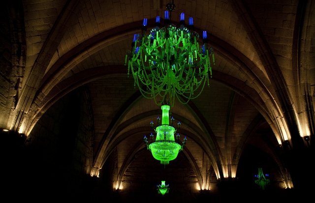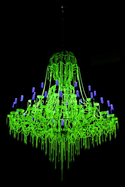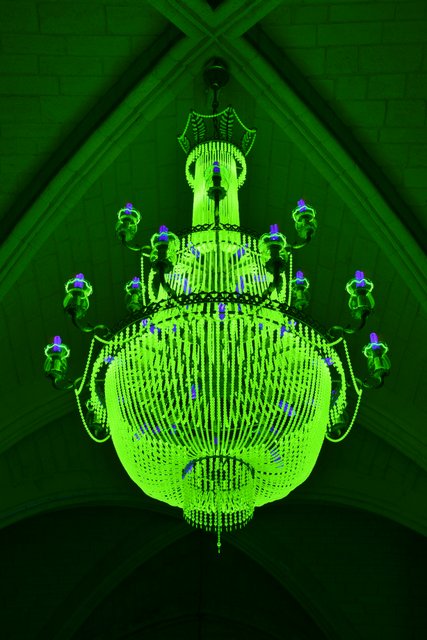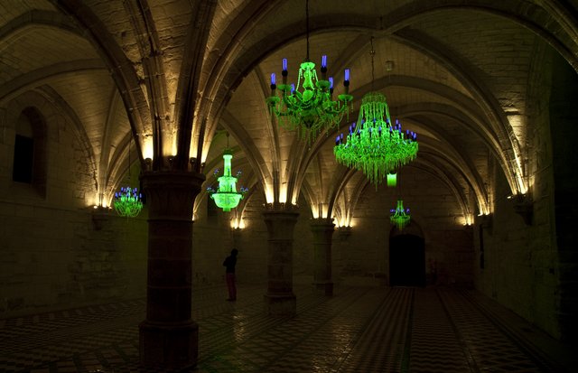 Dans la salle des Religieuses nous attend « Crystal Palace« , du nom du grandiose bâtiment tout en verre conçu pour l’Exposition universelle de Londres de 1851 qui brûla en 1936. La salle est plongée dans l’obscurité. Au plafond sont accrochés des lustres fluorescents. L’impression est saisissante. Chaque lustre, composé de billes d’uranium, représente une nation qui produit de l’électricité à partir du nucléaire. Plus sa production est importante, plus le lustre est grand. La France est bien placée.