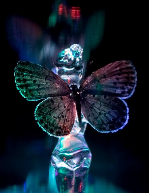 Mais voilà, les ailes de cette fée sont en réalité celles d’un papillon taxidermé dont l’œuf a été collecté non loin de Fukushima, dans le cadre d’une étude scientifique. Cette étude a montré que les papillons irradiés présentaient des malformations et des mutations génétiques. La petite fée post-atomique a pris du plomb dans l’aile… À travers cette œuvre minuscule, Ken et Julia Yonetani mettent en lumière les ravages que peut provoquer le nucléaire.