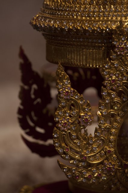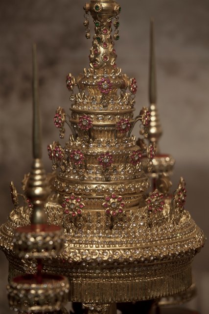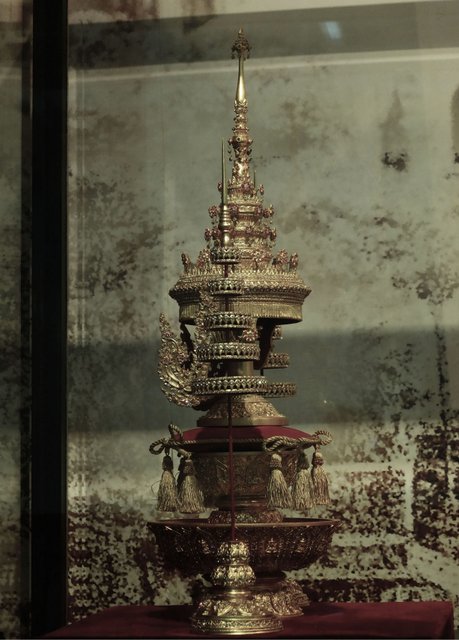 La couronne, c’est celle de Rama IV, quatrième roi de Siam (1804-1868), appelé aussi roi Mongkut, « couronne » en thaï. À l’époque, le souverain fait réaliser deux copies de sa coiffe royale pour les offrir à la Grande-Bretagne et à la France en guise de cadeaux diplomatiques. C’est ce présent inestimable qui, dit-on, aurait préservé l’indépendance, relative, du royaume de Siam.