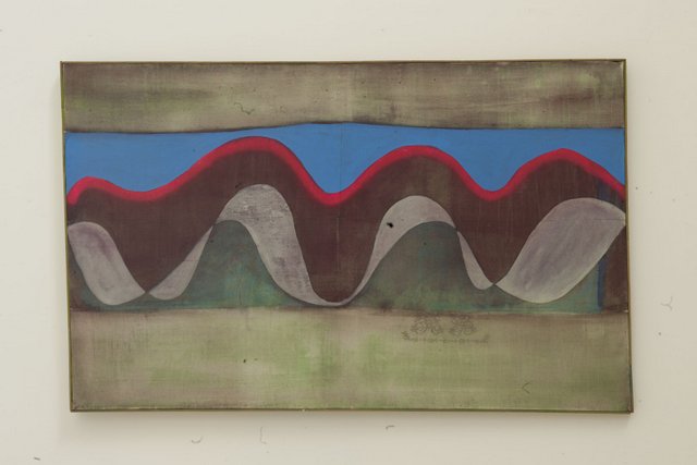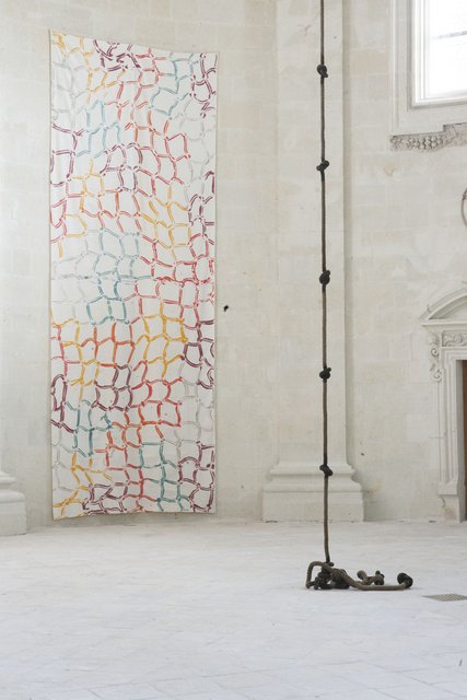 Des cordes et des nœuds sont posés sur la pierre du sol. Seule œuvre de l’exposition sur châssis, La Vague, hommage à Matisse, l’un de ses maîtres avec Picasso et Chabaud.