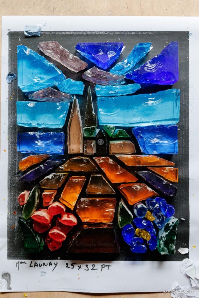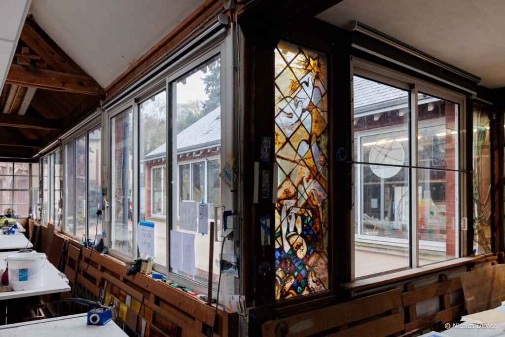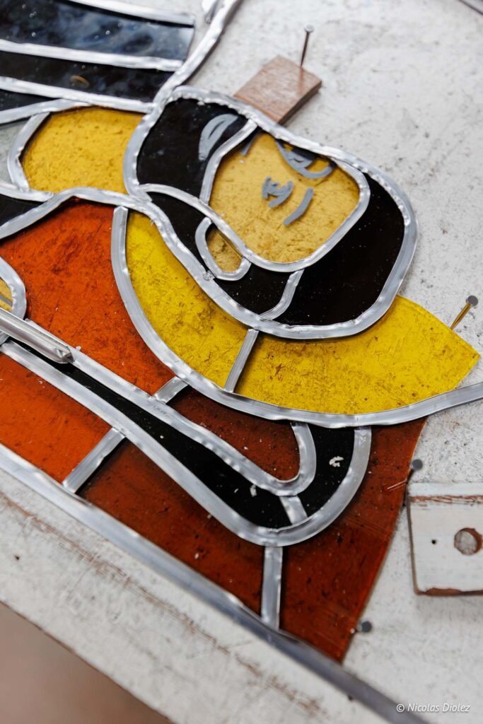En résidence dans un atelier d’artistes, les membres du collectif façonnent le vitrail à leur bon vouloir. Comme le lion ci-dessous, c’est un travail d’orfèvre, car le vitrail est particulièrement délicat à manier.